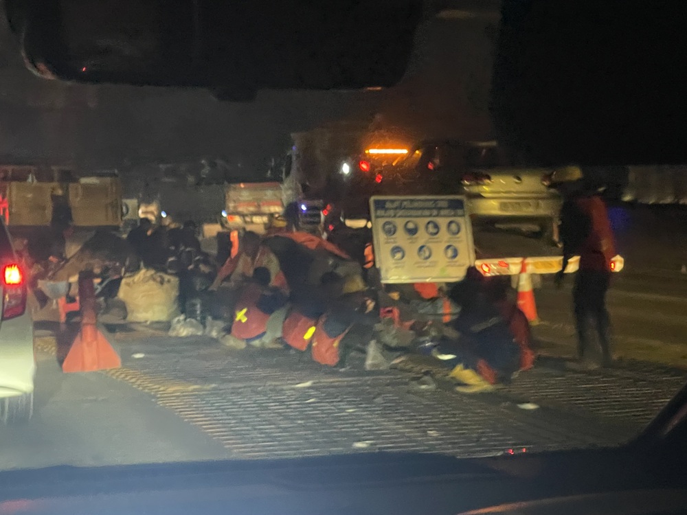 突然、高速道路の真ん中車線で工事が始まり大渋滞。