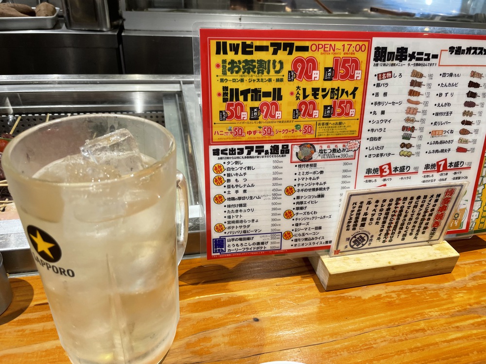 9時からオープンしている串焼き屋さんや24時間営業の居酒屋などなど。
