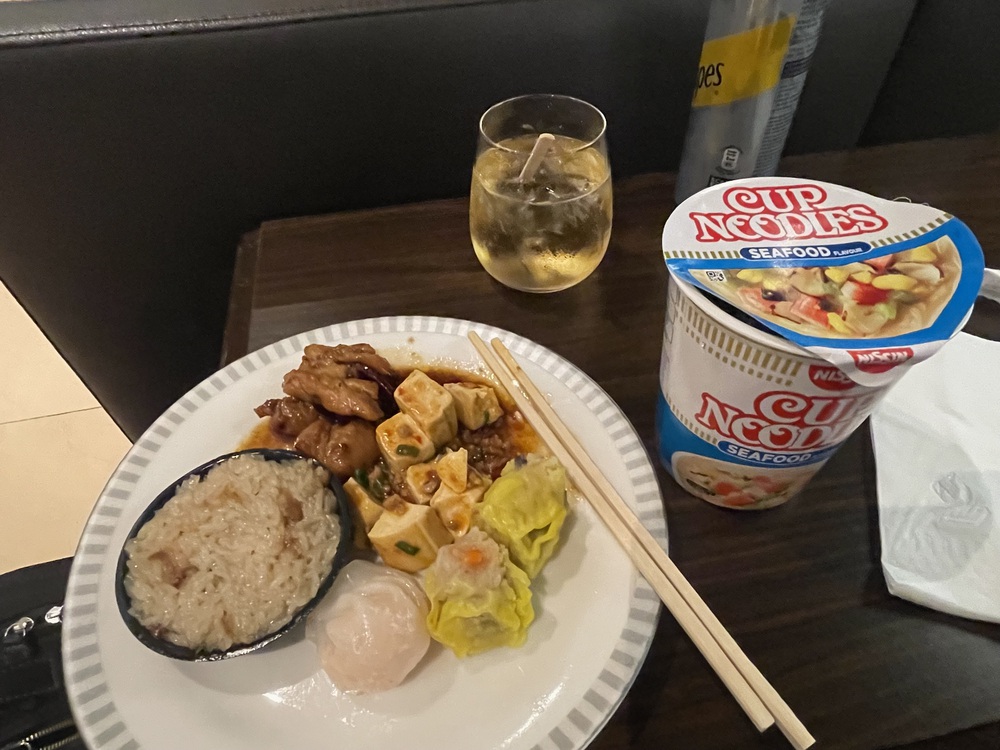 空港内のコンビニで購入した350円!!もするカップヌードルが晩御飯です。