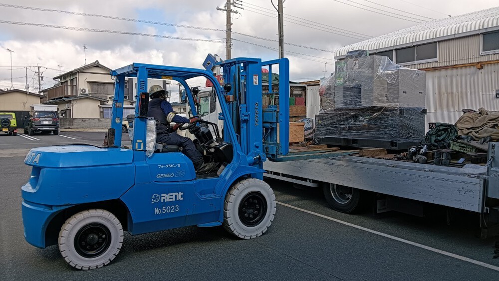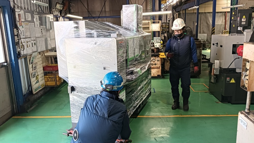 ⇓元台風10号の影響で天候が気になる中でしたが、NC転造盤が無事に到着しています。
