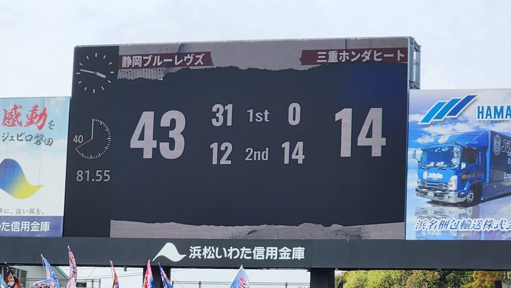静岡ブルーレヴズ 〇 43 – ● 14 ト三重ホンダヒート