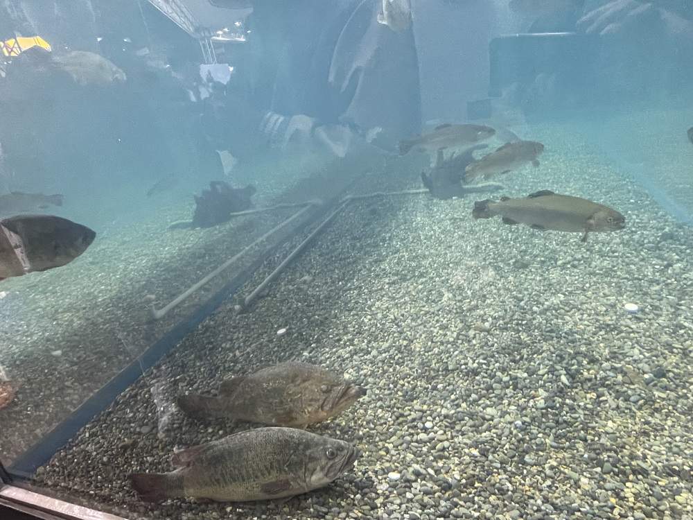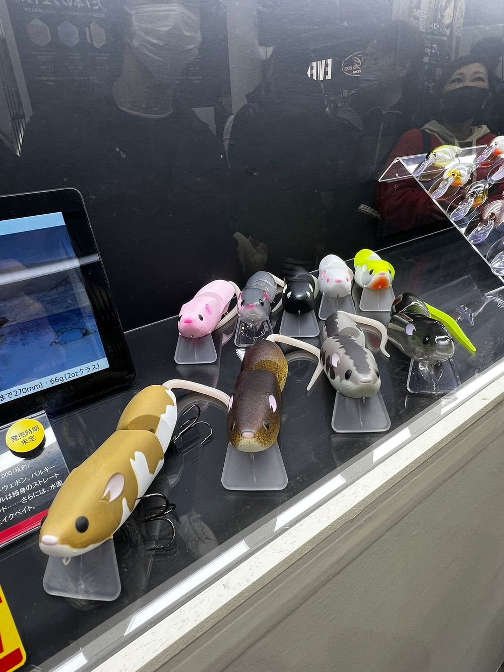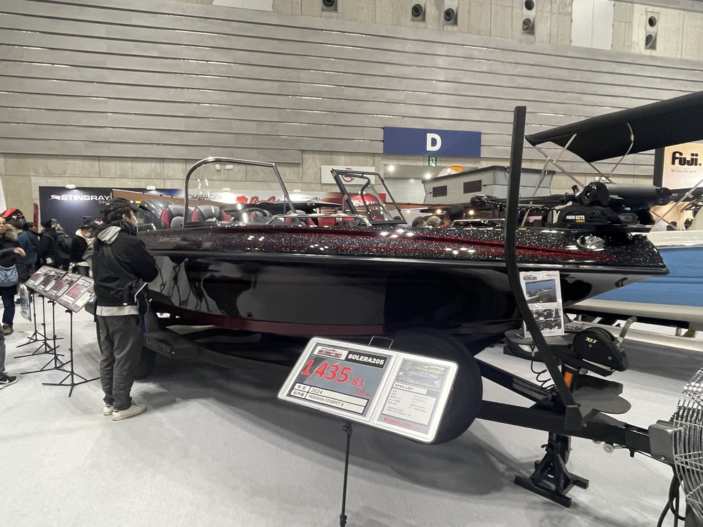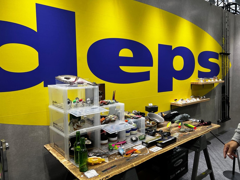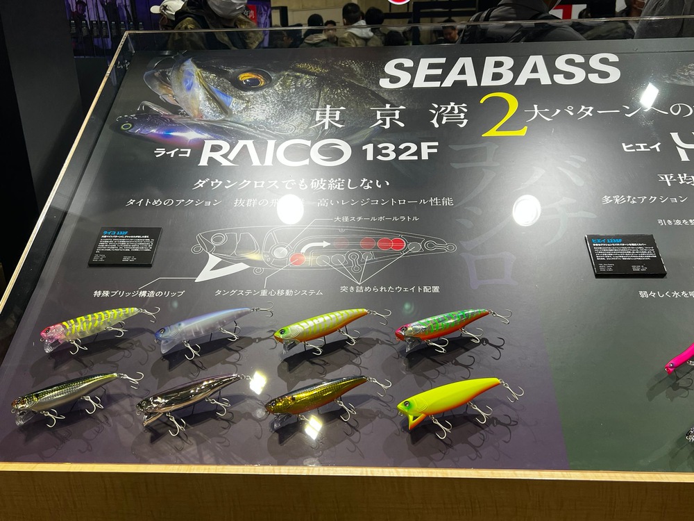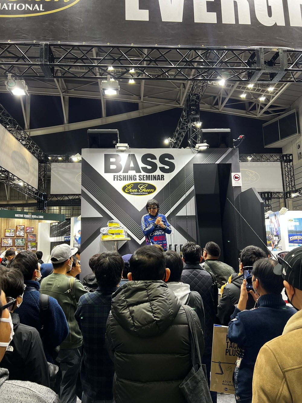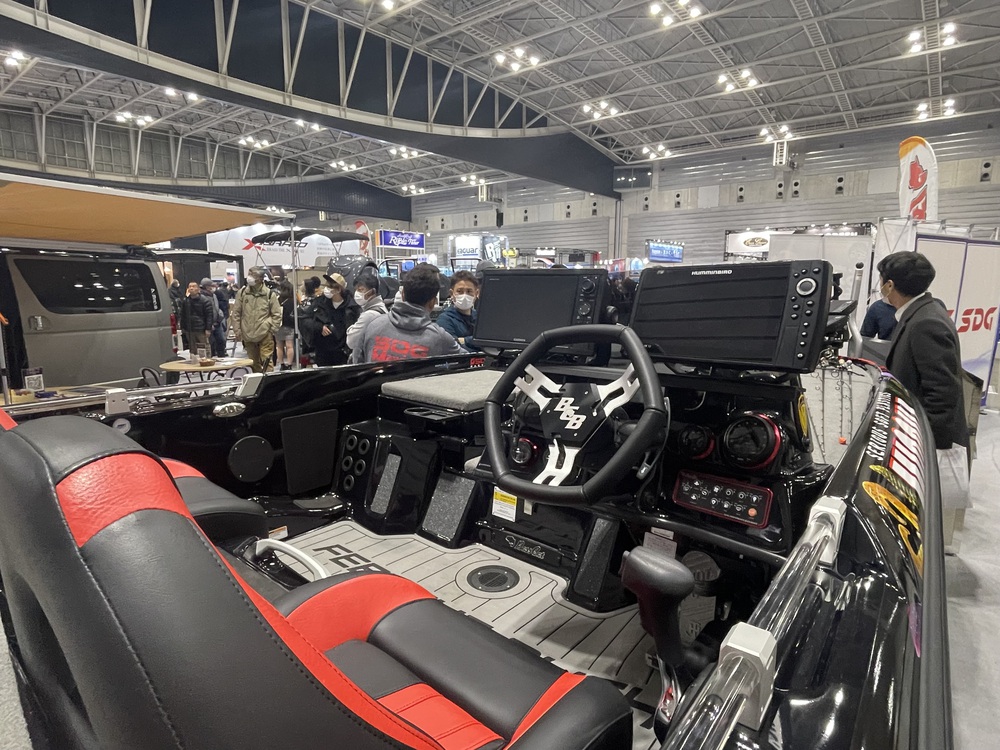 ルアーメーカーの展示ブースには、巨大なバスが…