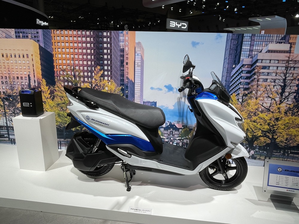 交換式バッテリーを使用した、電動スクーターの実証実験車「e-BURGMAN(イーバーグマン)」。