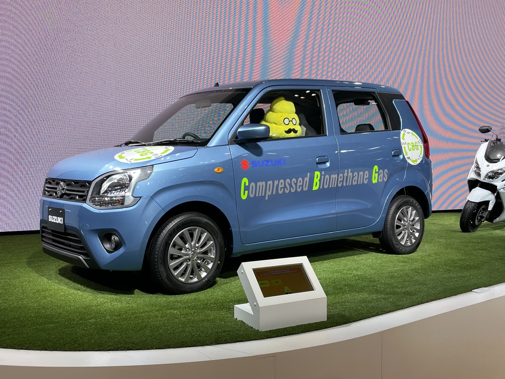 バイオメタンガス(牛糞を利用)を燃料と使用して走行できる、ワゴンR CBG車(Compressed Biomethane Gas)。