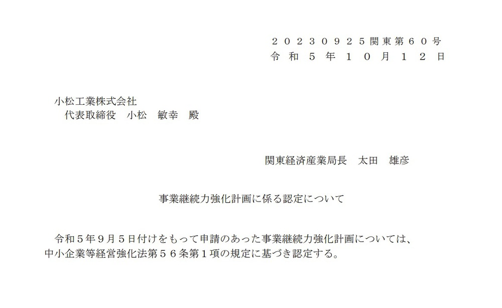この度私達小松工業株式会社は、「事業継続力強化計画に係る認定」を頂きました。