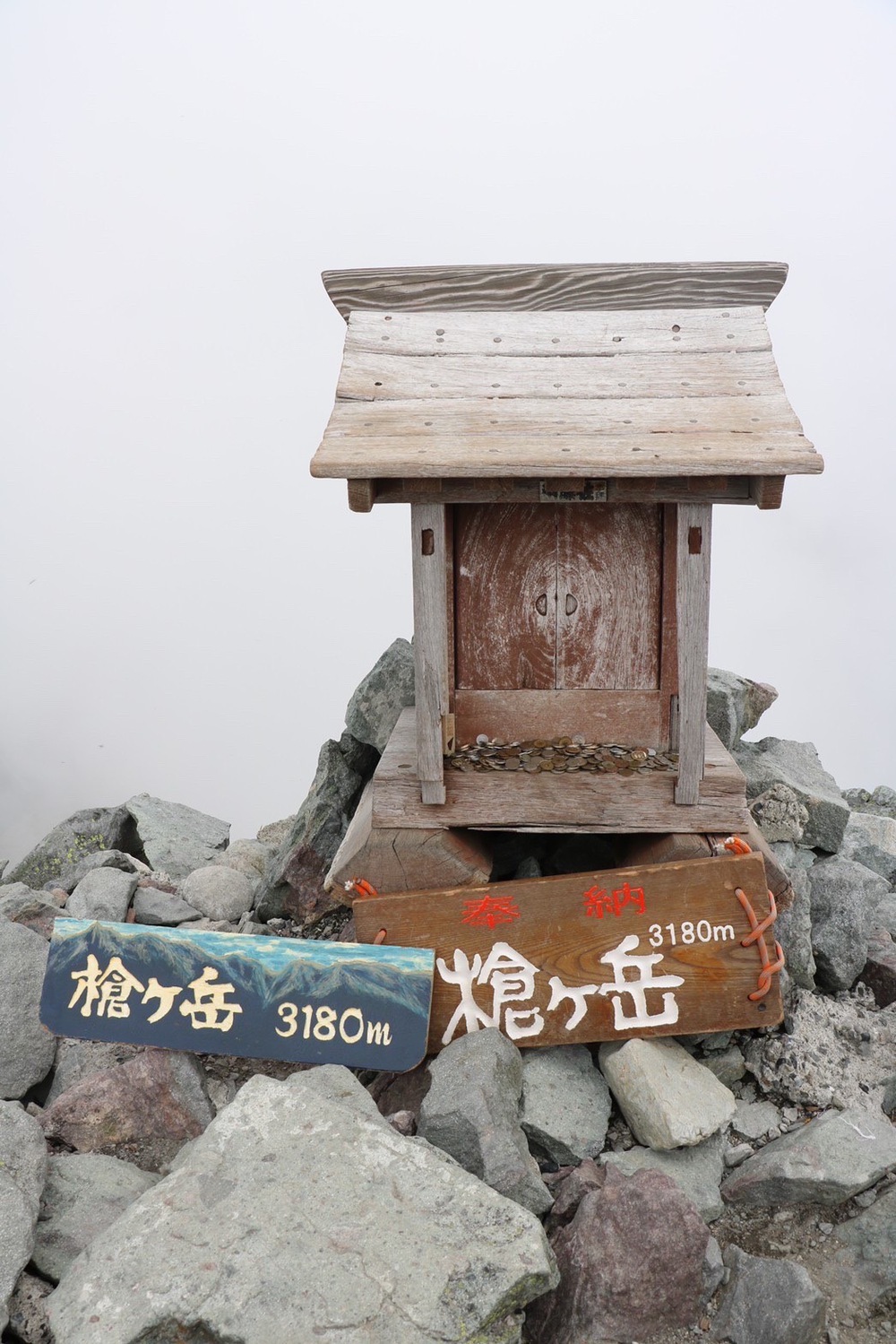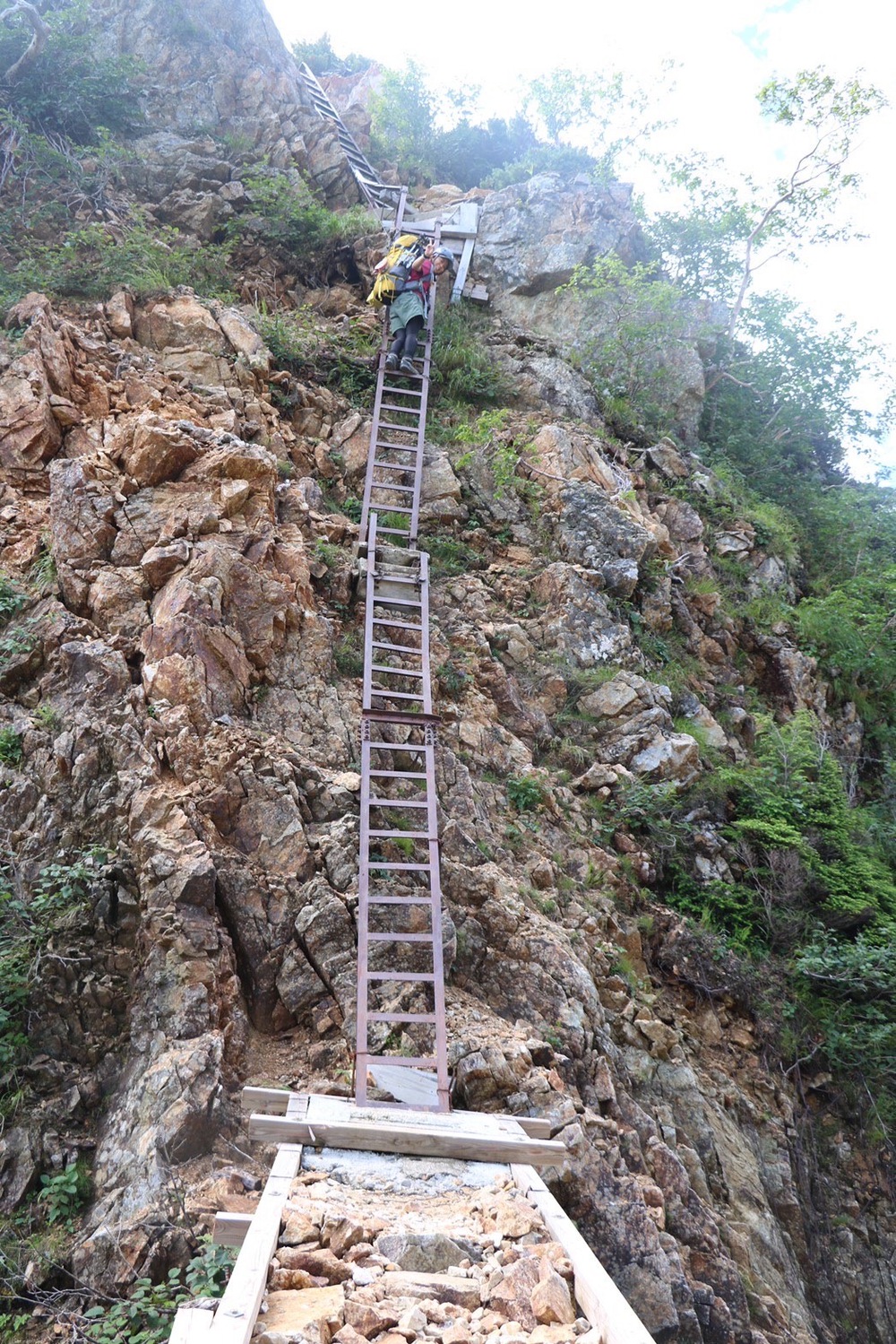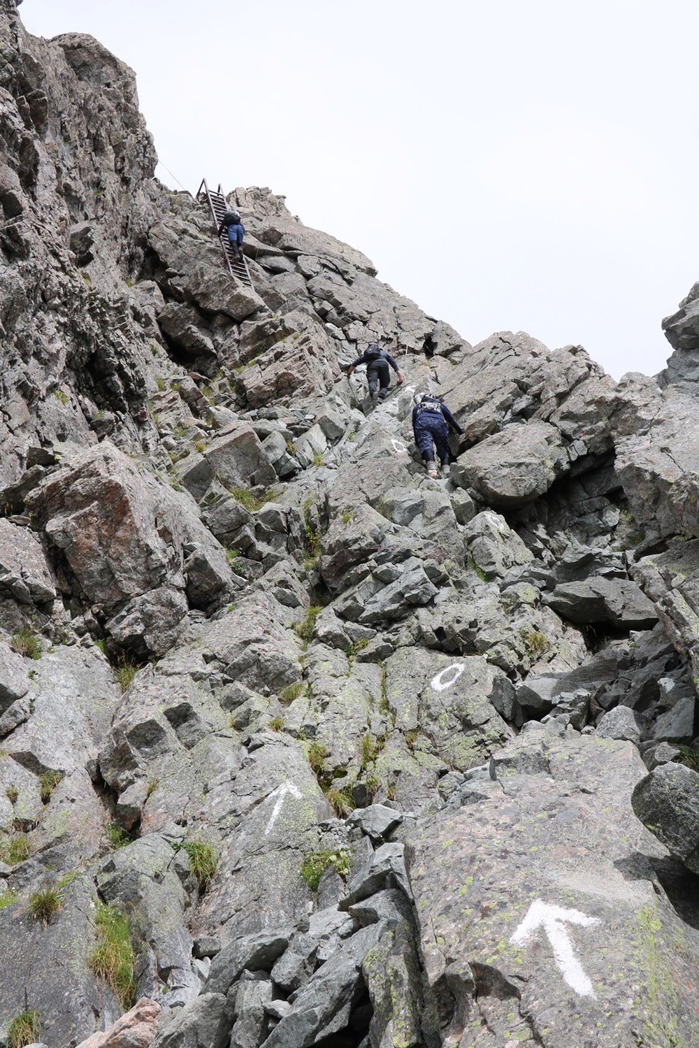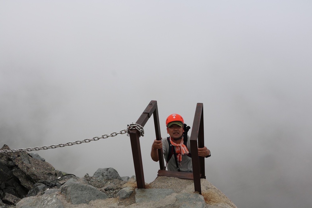 槍の穂先には鎖と梯子が設置、頂上直下の梯子は傾斜が約80度あり緊張感があります。