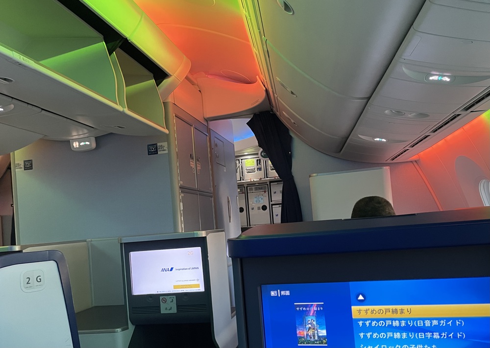 機内がレインボーカラーで装飾され、なんだか落ち着かない…デス。