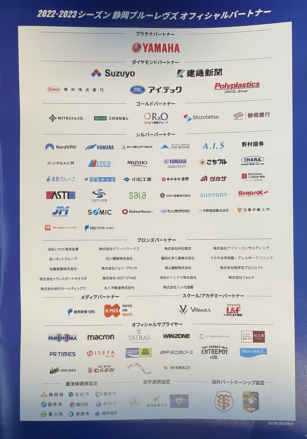 静岡ブルーレヴズ2022-23 SEASONの協賛御礼という事で、