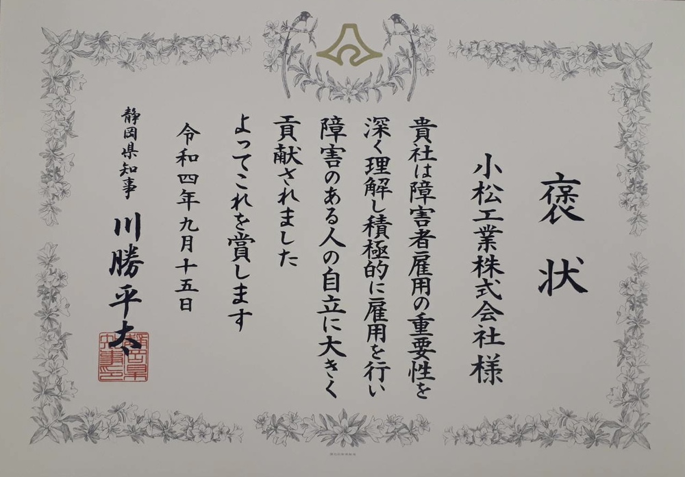 川勝県知事から直接褒状を頂きまして感激です。