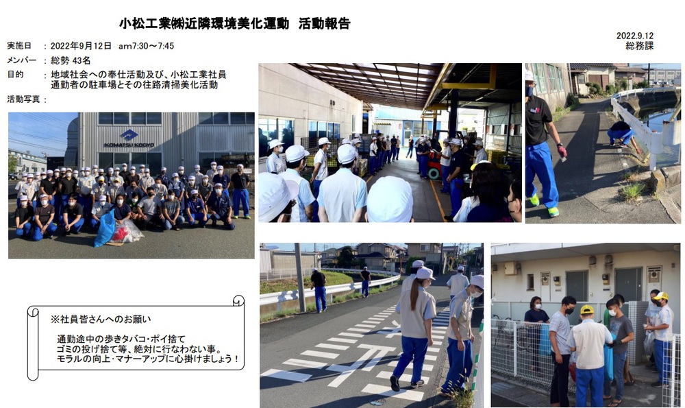 本日9/12(月)、43名と多くの社員の参加のもと「近隣環境美化活動」を実施致しました。