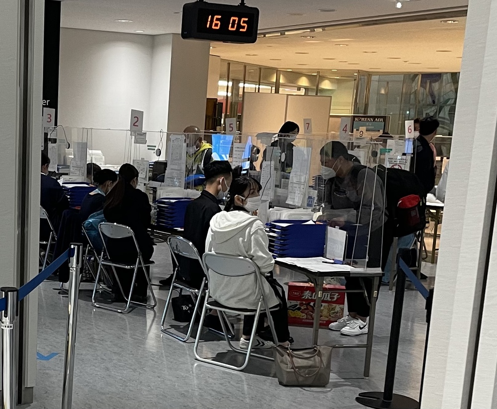 PCR検査前に体調確認や滞在国などを聞かれながら受付します。