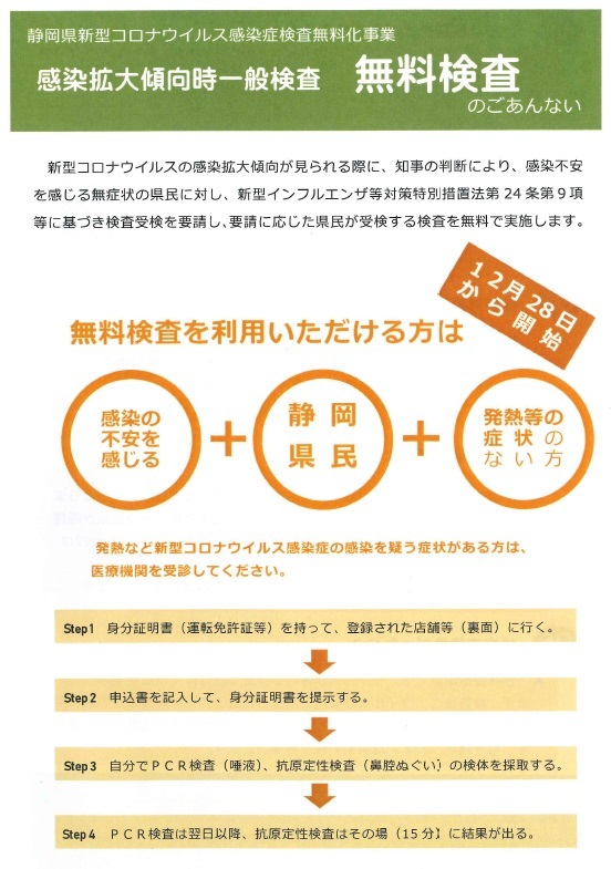 新型コロナウイルス オミクロン株の感染拡大する状況に置いて不安な日々を過ごされている静岡県民の皆様に対して、県は検査無料化事業を整備。