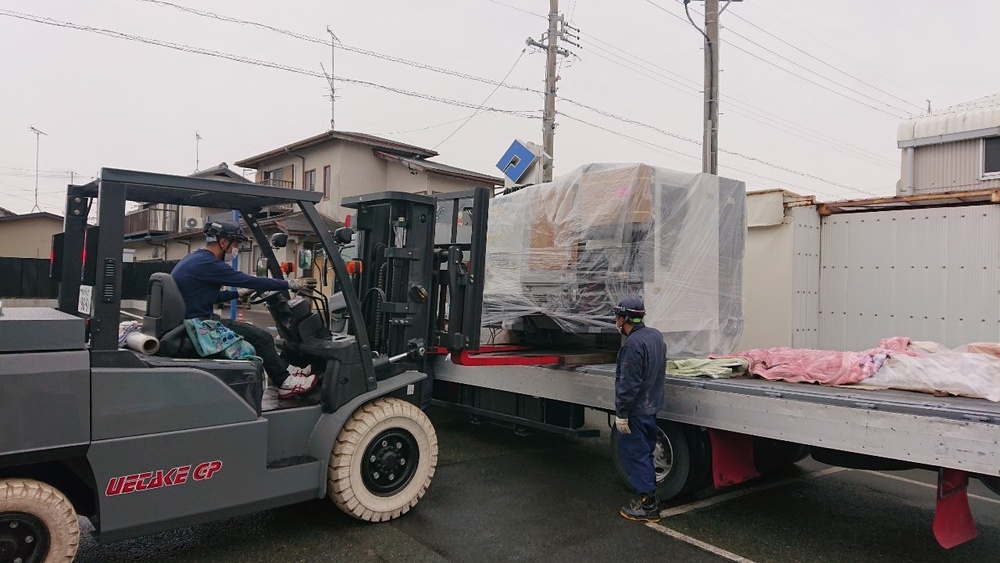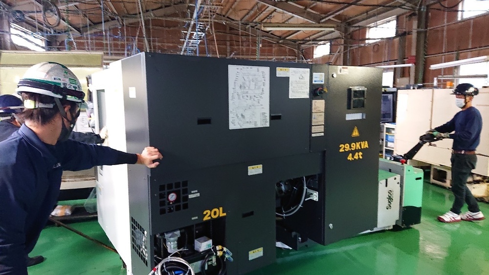 工場内は、ハンドリフトに切り替え、安全第一で予定地まで。
