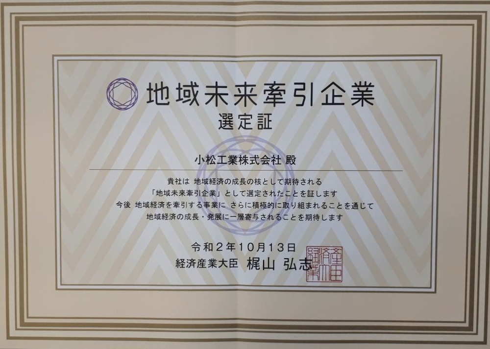 この度弊社小松工業株式会社は、経済産業省より地域経済の中心的な担い手になりうる企業として、「地域未来牽引企業」 に認定をされました。