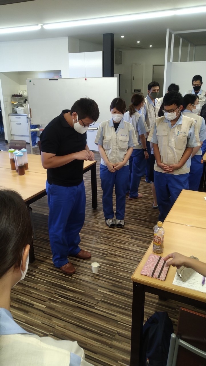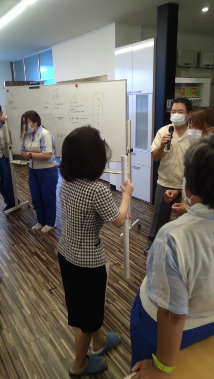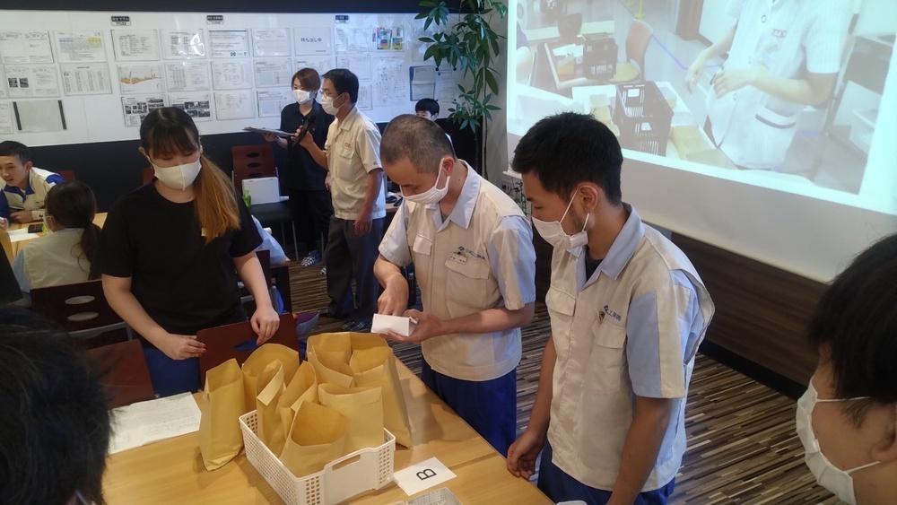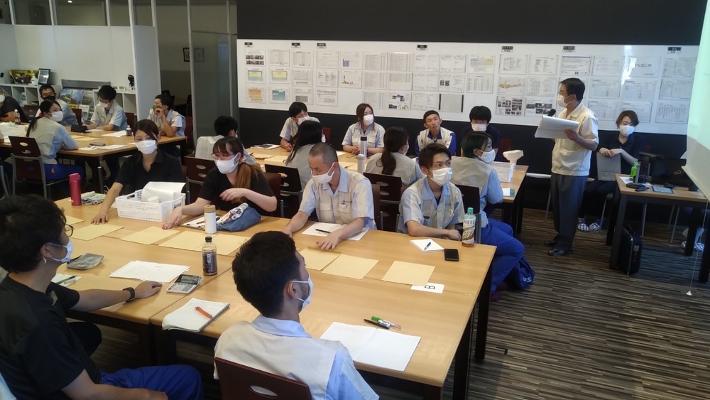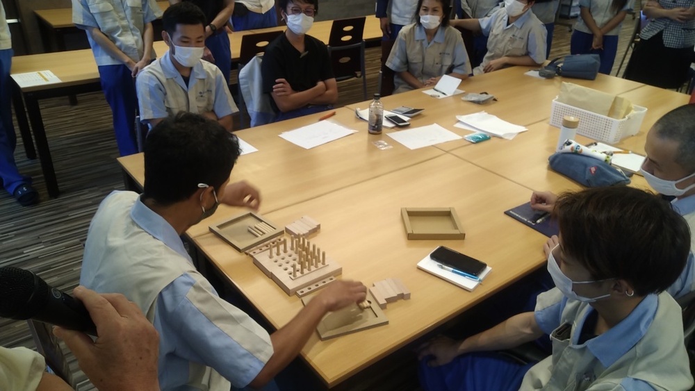 グループに分かれ、コイン落としゲームや1個流し/バッチ流しゲームを用いてカイゼン手法を学びました。