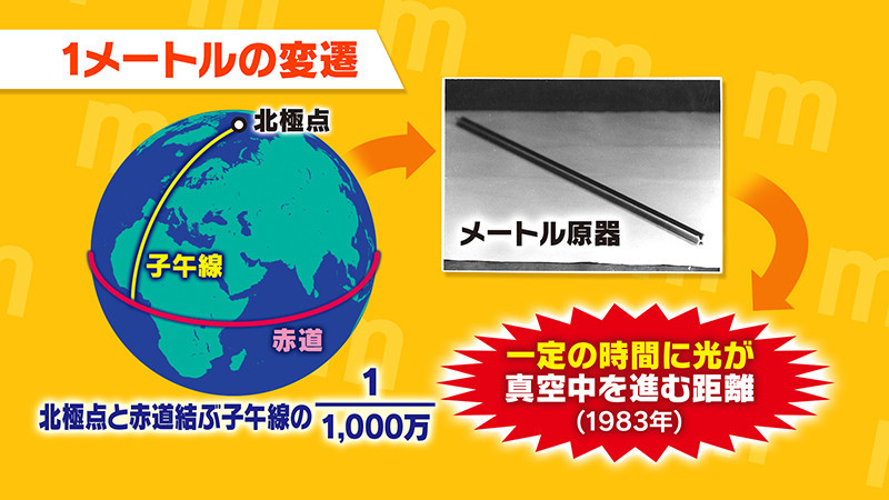 ちなみに、測定の大本となる長さの基準は、フランスパリを通る子午線の北極⇔赤道の距離を算出。