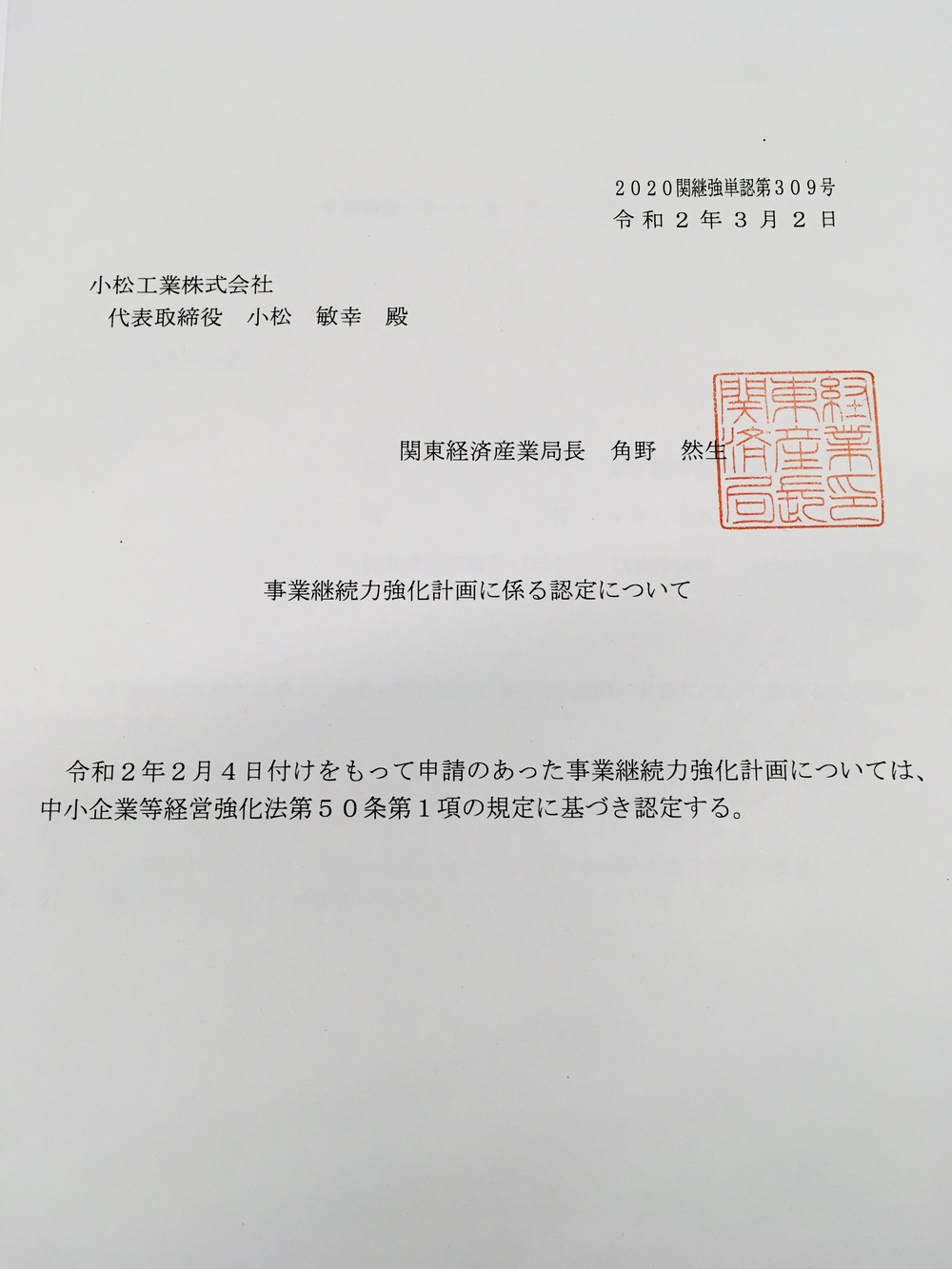 この度弊社小松工業株式会社は、中小企業強靭化「事業継続力強化計画」の認定を頂きました。