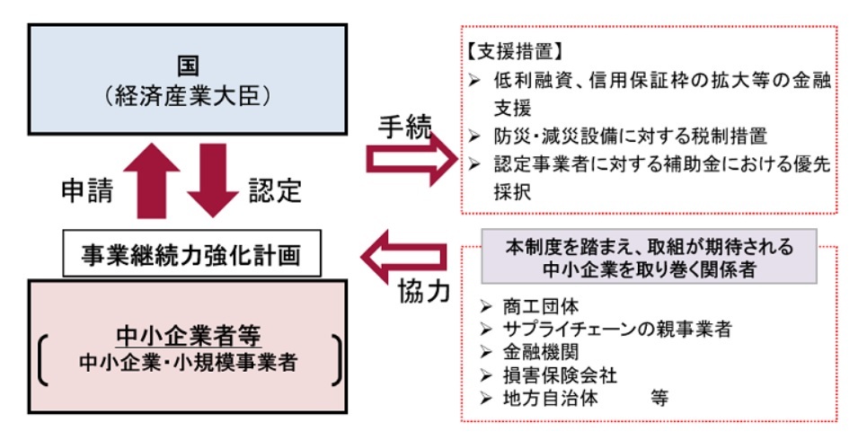 「事業継続力強化計画」とは、中小企業が自然災害等による事業活動への影響を軽減することを目指し、事業活動の継続に向けた取組を計画するものです。