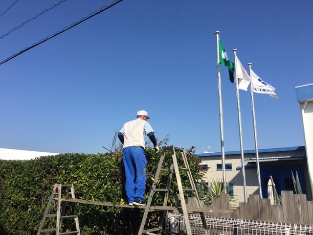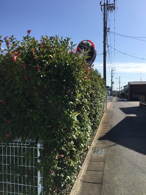 垣根が伸びてカーブミラーに掛かって安全上もよろしくありません。