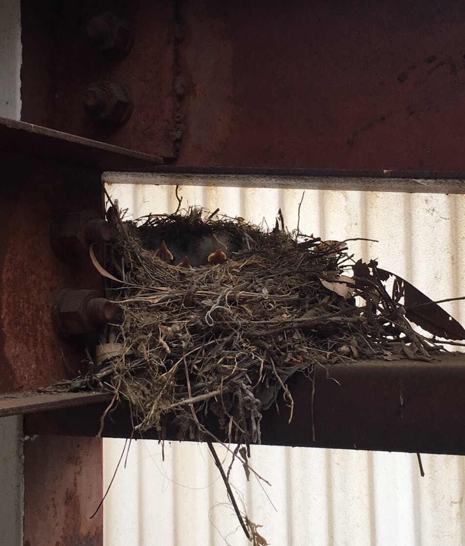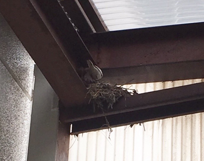 工場内の中庭に抜ける通路上に、いつの間にか鳥の巣が。