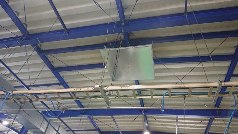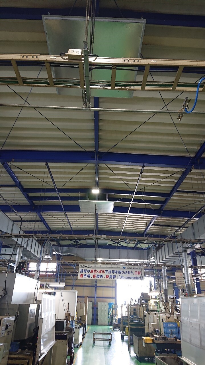 天井部のルーフファン下にオイルパンを設置します。