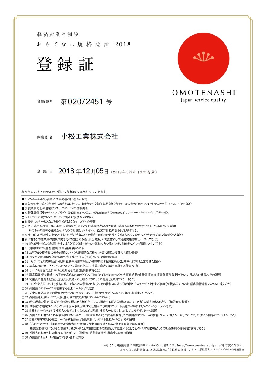 この度、当社はおもてなし認証の第1ステップとして「紅認証」(自己適合宣言:サービス向上の取組に意欲的なサービス提供者証)を取得致しました