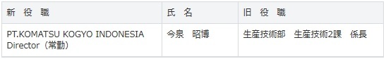 小松工業株式会社は、2018年09月21日付で人事異動を次の通り行った。