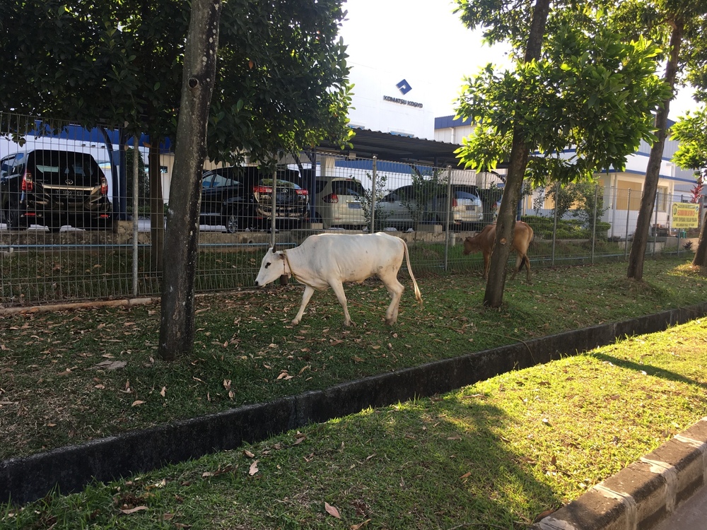 工場の前では、牛が除草作業をしています。