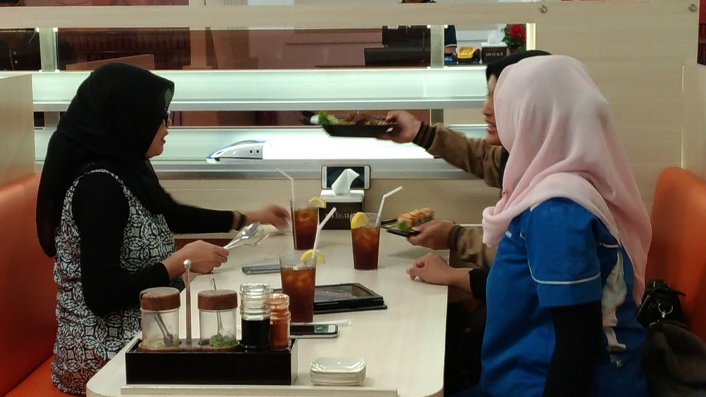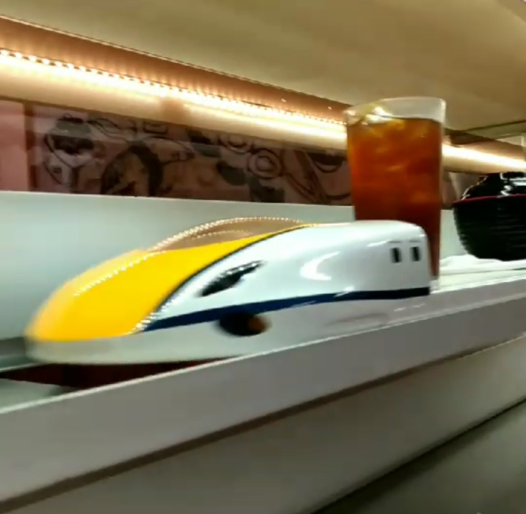 お店は日本の寿司の様な注文方式で、食事は新幹線が運んでくれます。