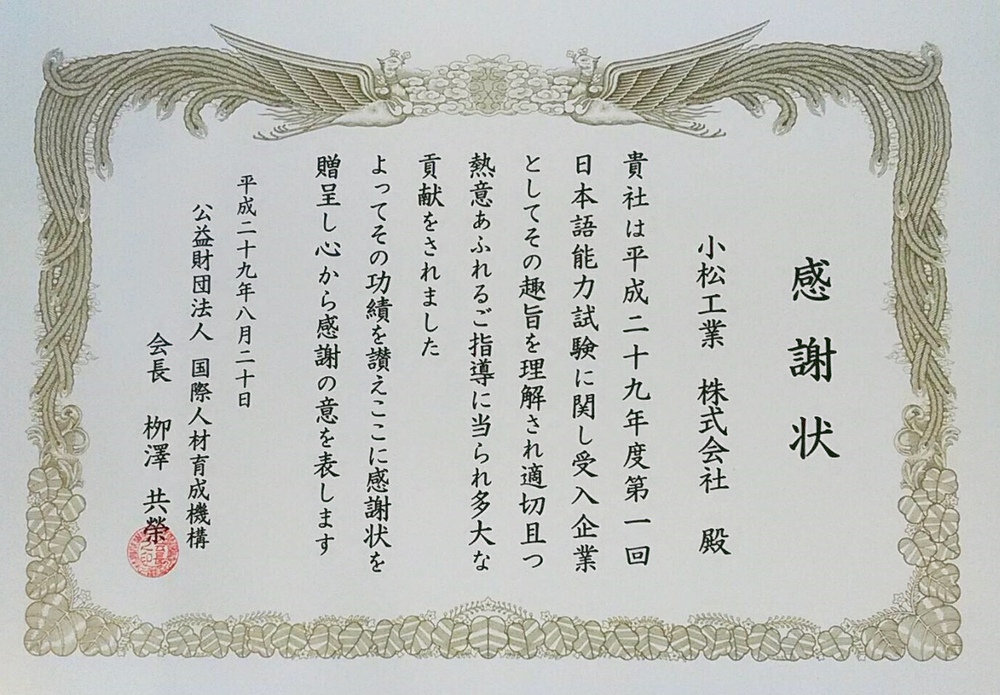 過去から今回までの社の取組み、実績を評価され国際人材育成機構 様より感謝状を頂きました。