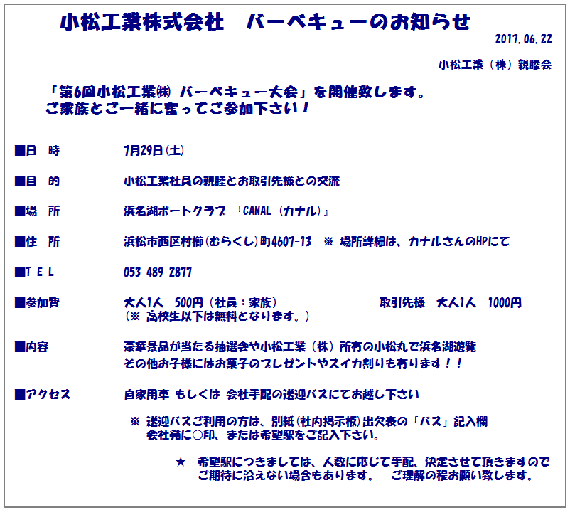 SUMMER BBQ 2017! 2017年07月03日 | BBQ小松工業 Japan忘年会・懇親会等 下記日程で開催致します 皆さん奮って参加を ⇓クリックで拡大表示できます。 Post Views: 4