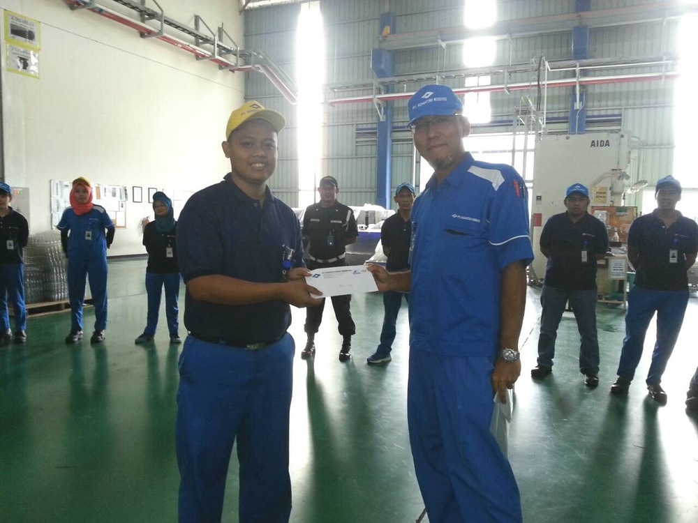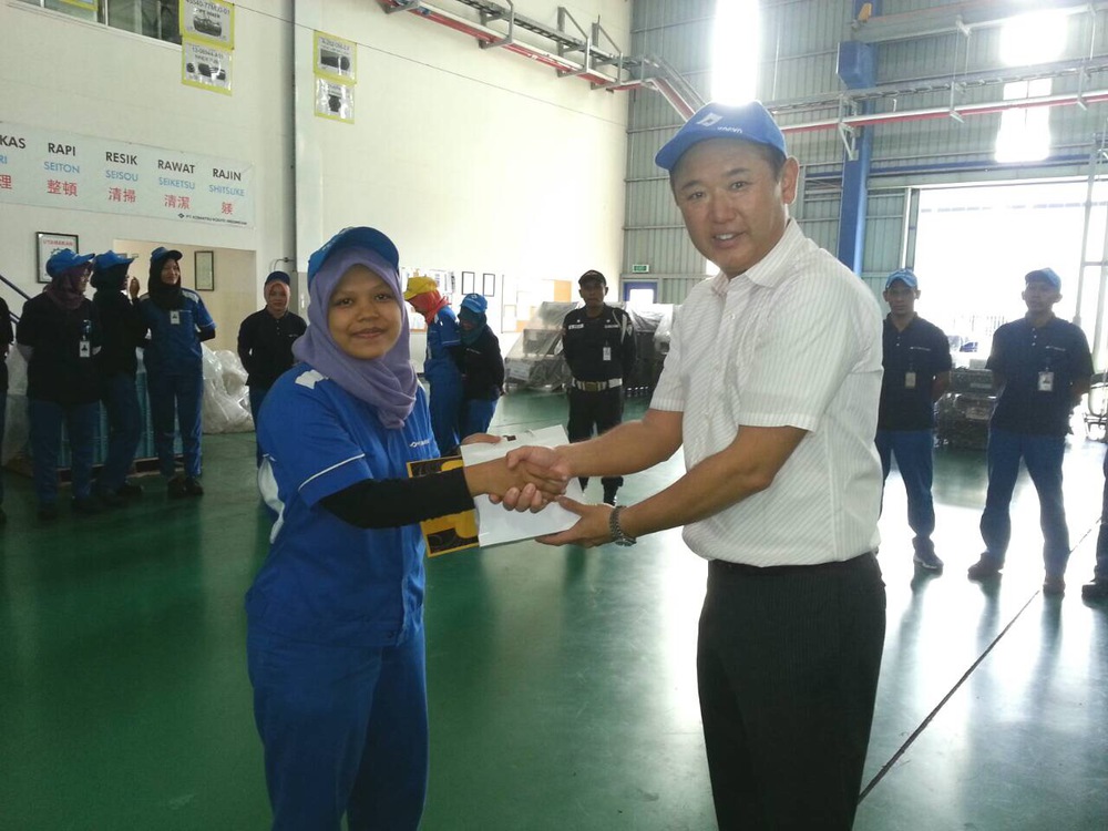 朝の全社ミィーティングにて、昨年2016年の皆勤賞の皆さんに記念品の授与を致しました。