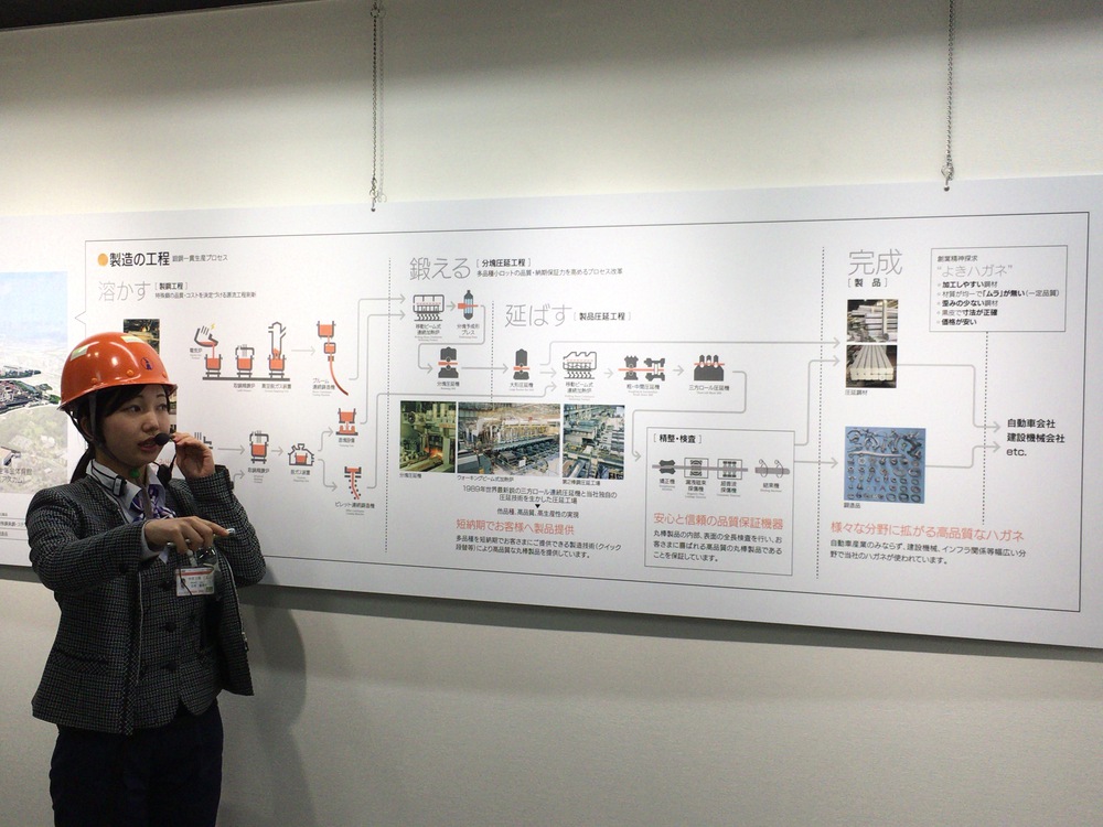 スクラップの溶解からブルーム鋳造、圧延、冷却、切断、検査…と一連の工程を分かりやすく説明を頂きました。
