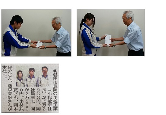 本日4月27日に小松工業㈱及び社員有志一同より被災した地域への支援としまして、