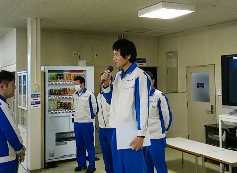 ↓↓今月の全体朝礼で全社員に向け帰任の挨拶の一コマです。