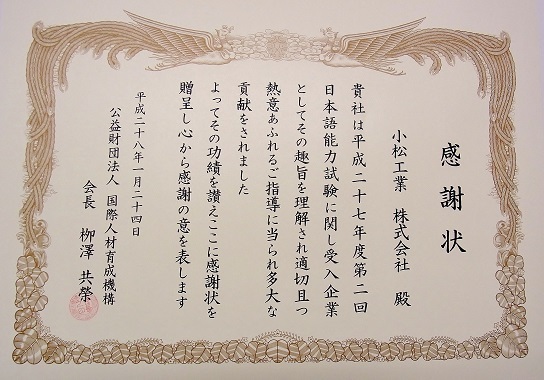 2016年1月24日付けで、国際人材育成機構 栁澤共榮会長より感謝状を頂きました。