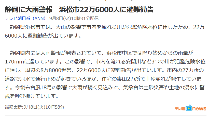 ・・しかしながら、昨日から本日にかけて台風18号が東海地区、特に浜松、磐田に甚大な被害、