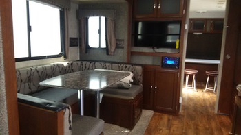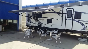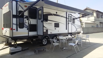 休憩所(トレーラーハウス)に取り付いていたオーニングが思いのほか大きくびっくりしました。