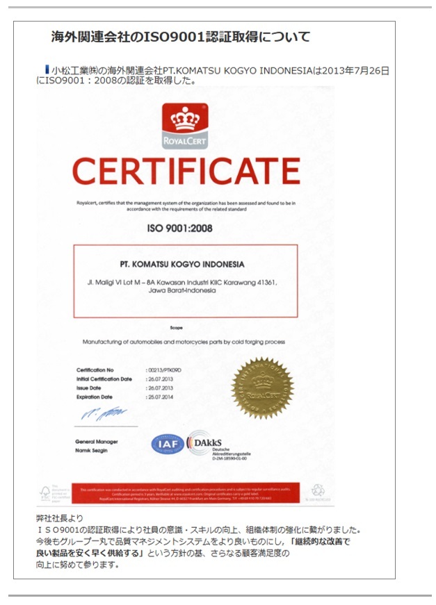 小松工業㈱の海外関連会社PT.KOMATSU KOGYO INDONESIAは、
