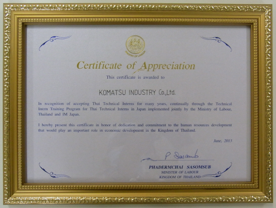 2013年7月22日、タイ王国労働大臣 PHADERMCHAI SASOMSUB様より感謝状を頂きました。