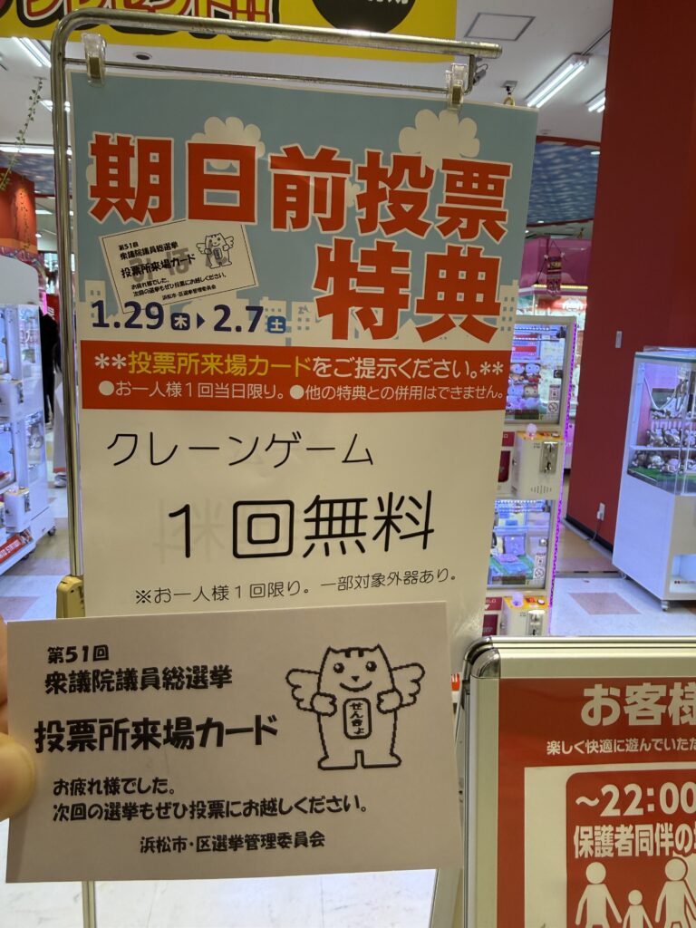 浜松市は、なんと!クレーンゲームが1回無料です…